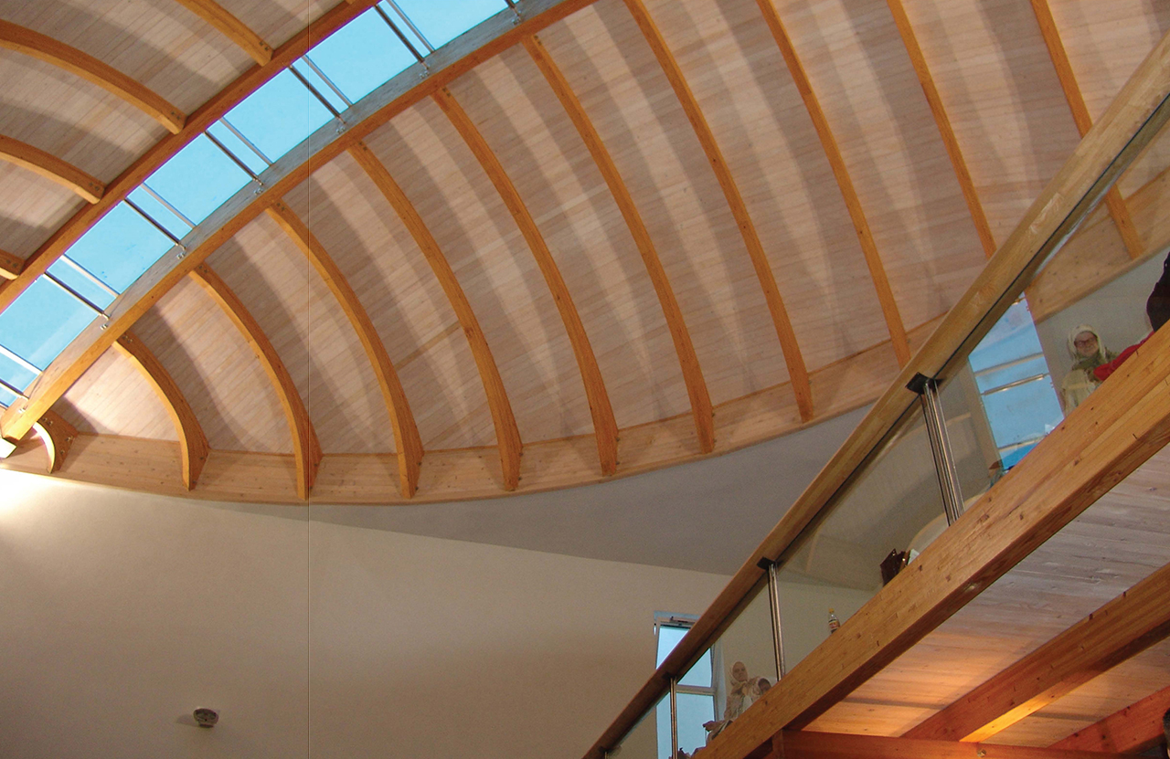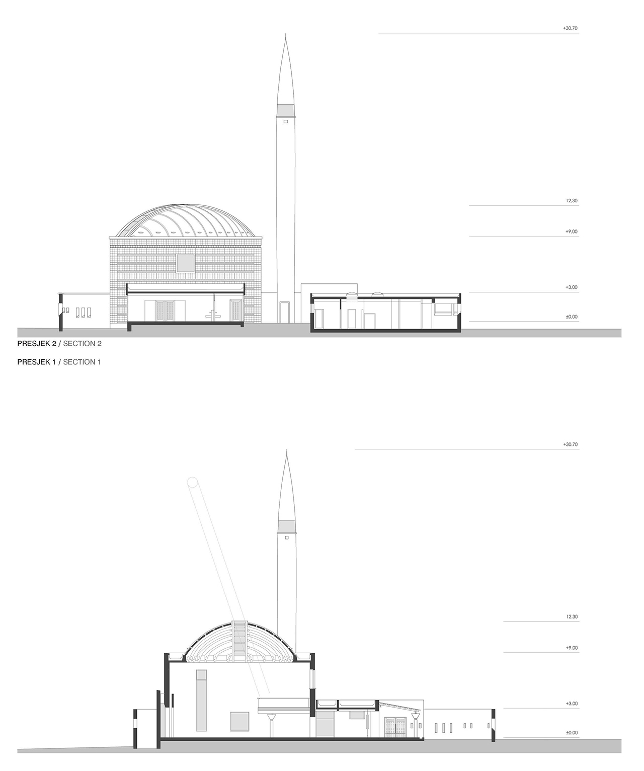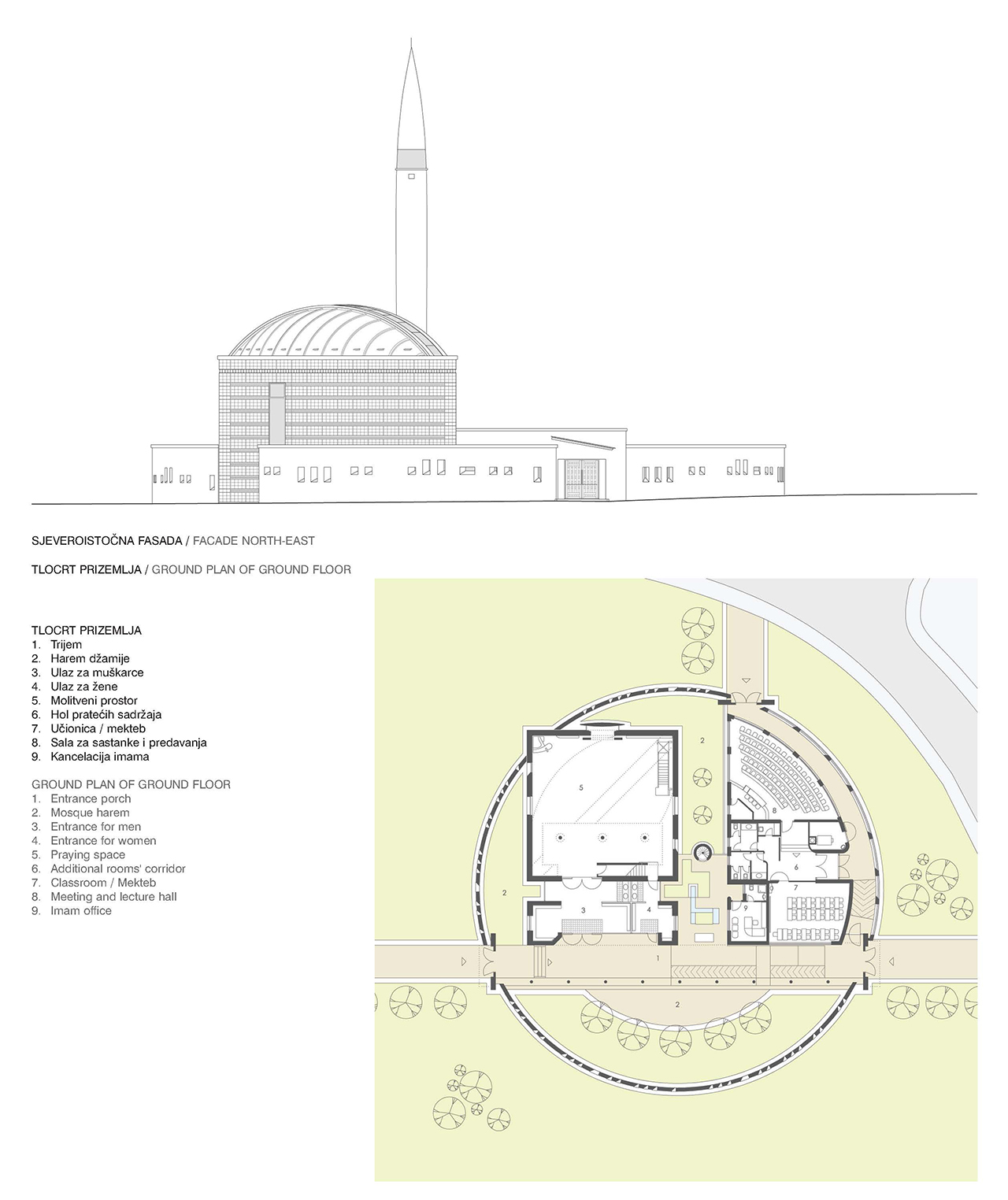 Krov glavnog molitvenog prostora je stilirizirana kupola, u obliku "izvrnute lađe" (asocijacija na čamce koji su plovili i plove rijekom Savom), koja je postavljena u pravcu sjever-jug, a dijagonalno u odnosu na tlocrt molitvenog prostora. "Dno lađe" je zastakljena traka, koja je u funkciji glavnog svjetla u molitvenom prostoru. Sunčevim kretanjem ovo svjetlo u molitvenom prostoru ocrtava različite slike čime se ovaj prostor u svako doba dana drugačije doživljava. Dodatno svjetlo dolazi kroz prozore, koji obezbjeđuju i dobru prirodnu ventilaciju i provezanost zatvorenog prostora sa zelenilom u haremu džamije. Munara džamije nije karakteristična za tradicionalne džamije u Bosni i Hercegovini kada je mujezin sa šerefe munare pozivao vjernike na molitvu. Projektant se opredijelio za dizajn koji je u skladu sa današnjim potrebama; nema mujezina da pozvaju sa šerefe – pa nema ni šerefe, ali su ostavljeni kandilji za najavu blagdana i ugrađen je odgovarajući razglas sa kojeg se vjernici pozivaju na molitvu. Ovo nam se učinilo prihvatljivim i racionalnijim rješenjem.