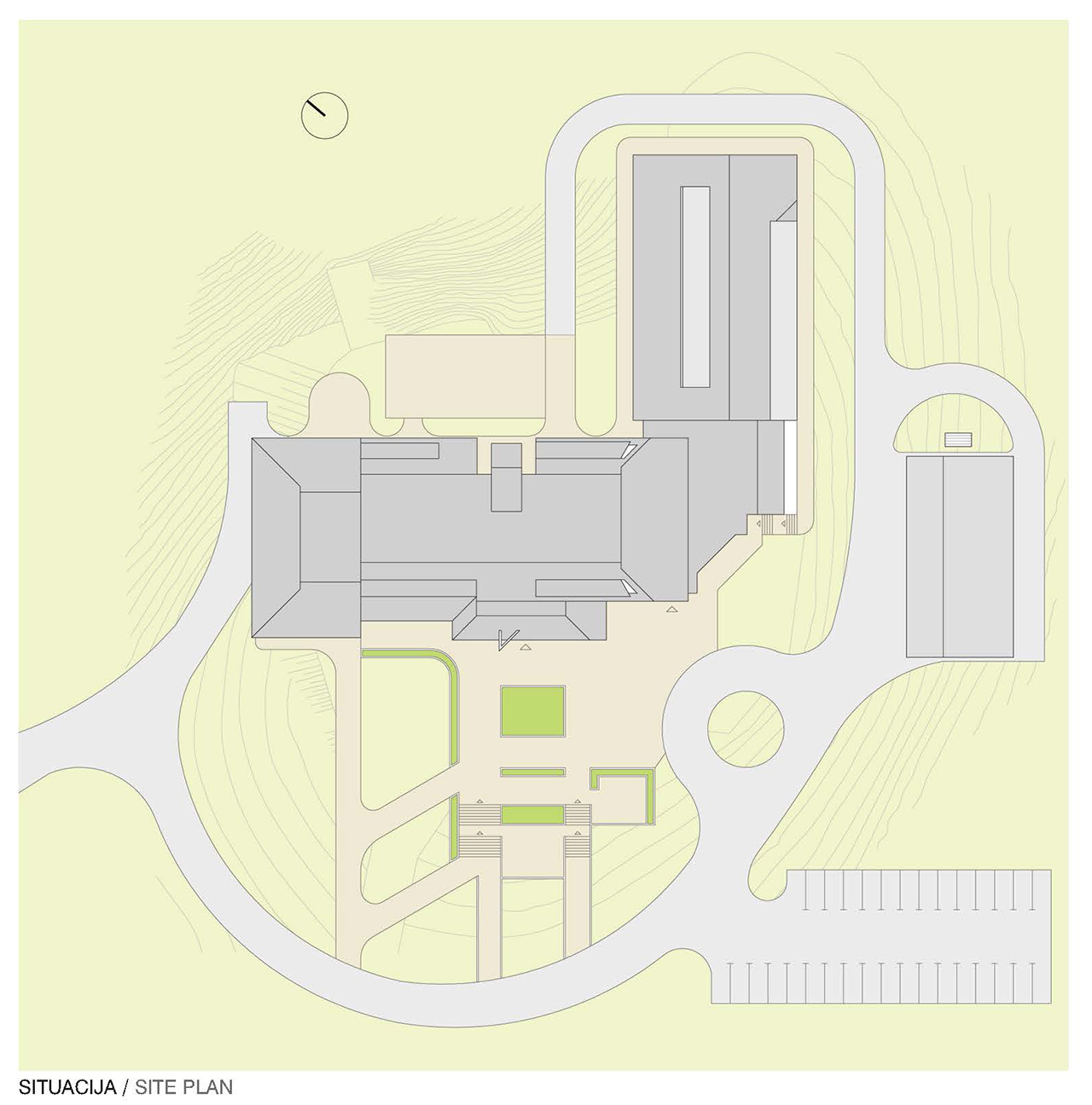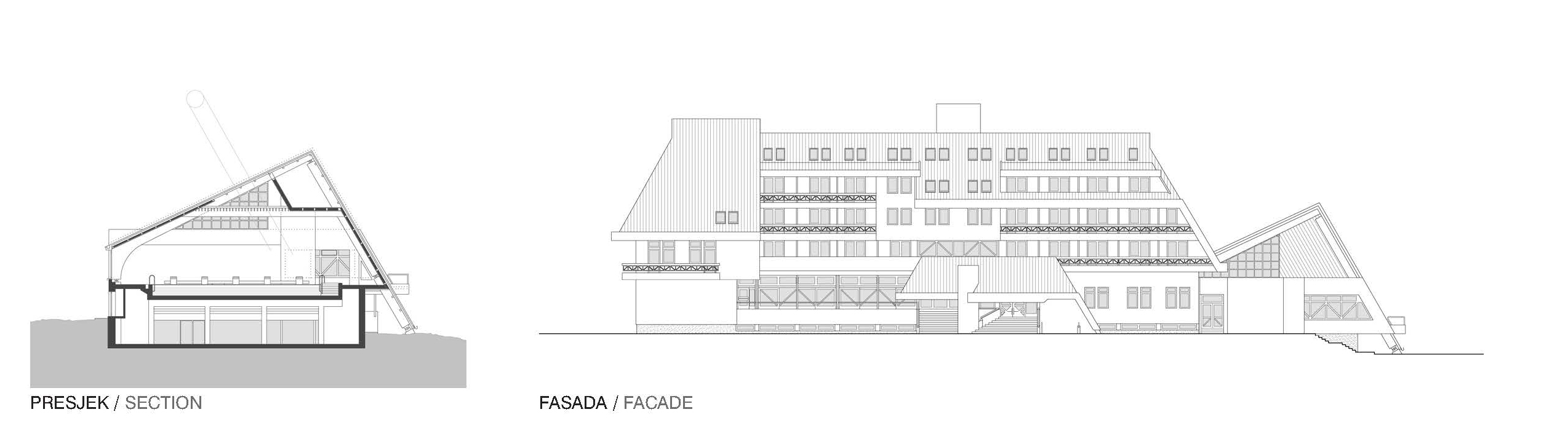 Dinarska kuća koju karakteriše četvorovodni strmi krov sa niskim postamentom i kosine terena koje formiraju brijeg i plato na kojem je objekat postavljen, bili su glavni poticaj za oblikovanje objekta čije će krovne ravni biti nastavak kosina okolnog terena. Drvo kao primarni materijal u obradama površina u enterijeru i eksterijeru veza je sa podnedbljem i okolišem obraslim bogatom šumom. Lokalitet objekta odvojen je od susjednih naselja tako da je pristup posjetilaca planiran putničkim automobilima i autobusima čije parkiranje je predviđeno na terasastim zaravnima uz pristupni put a u neposrednoj blizini hotela.