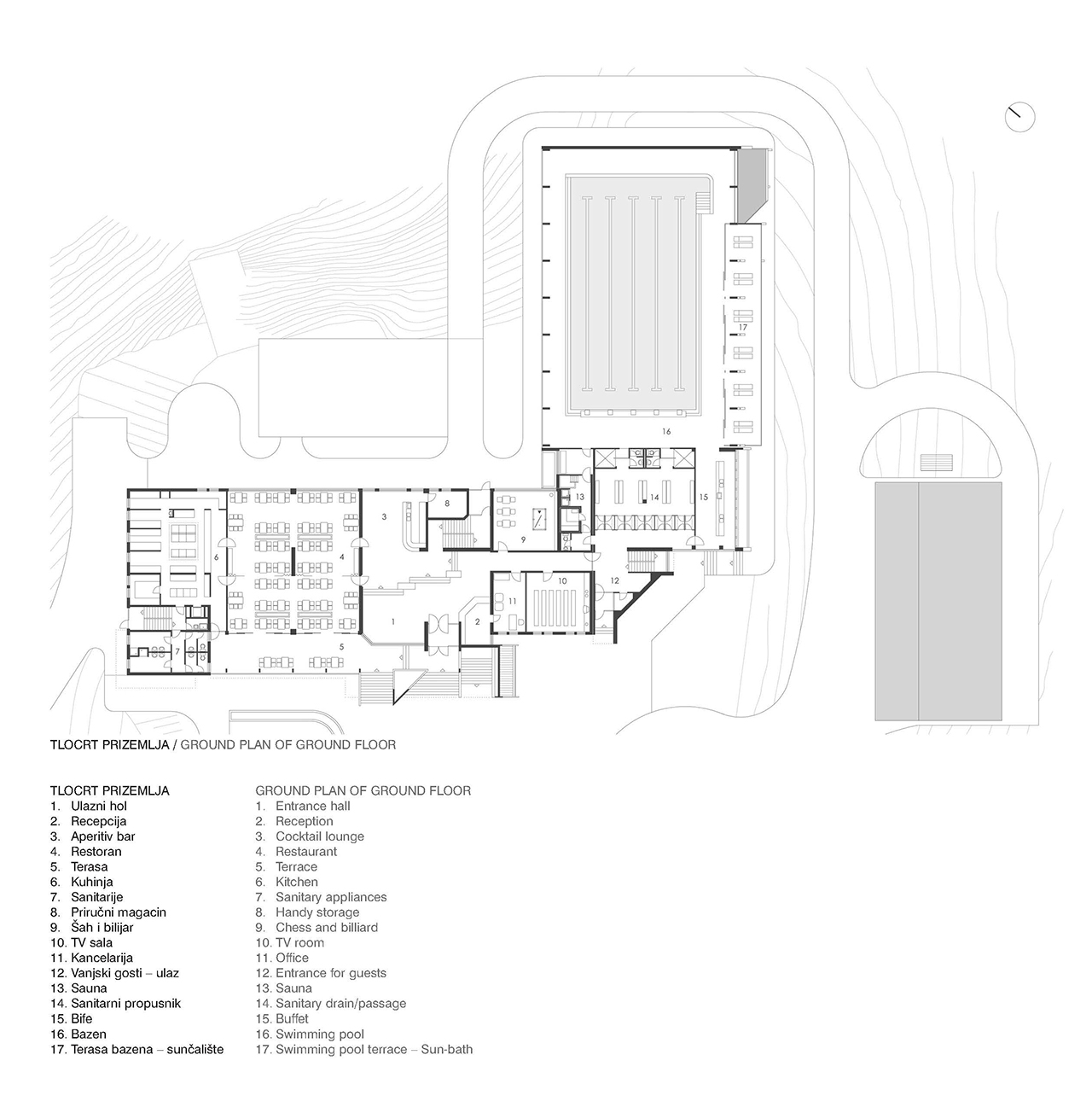 Bogati društveni sadržaji i terapijski dio sa zatvorenim bazenom i kuglanom obezbjeđuju gostima sadržajan i ugodan odmor u toku njihovog kraćeg ili dužeg zadržavanja. Terasa ispred bazena u ljetnom periodu se spaja sa bazenskim prostorom čime se ovi sadržaji integriraju sa okolnim zelenilom.